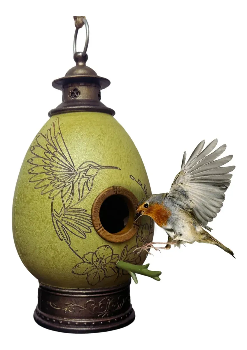 Com detalhes artísticos delicados, nossa casinha de pássaros é uma obra de arte que vai encantar a todos que visitam o seu jardim. *Instalação Versátil: Seja pendurada em uma árvore ou repousando em uma superfície plana, a instalação é simples e flexível, perfeita para qualquer jardim.