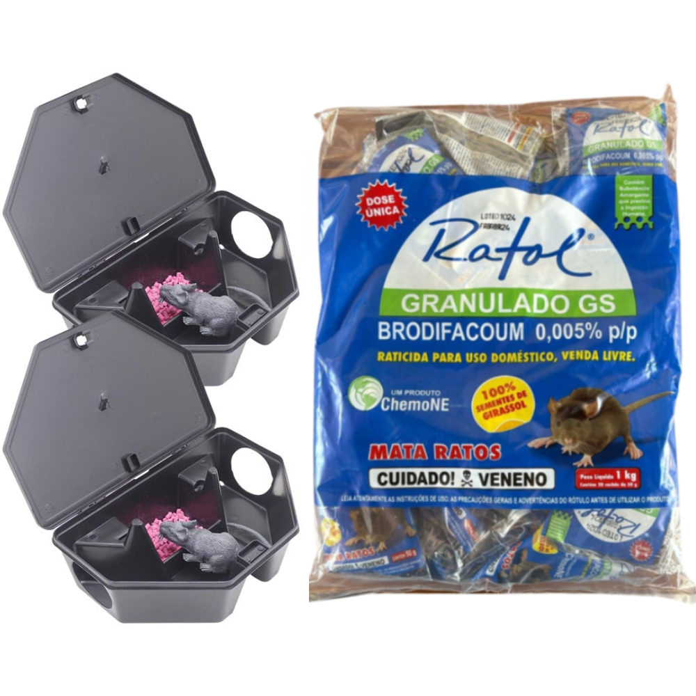 - Quantidade: 2 armadilhas Ratox 3 + 1kg de raticida Ratol