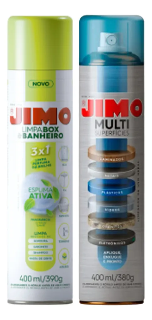 Kit Jimo Limpeza Perfeita Limpa Box e Multisuperfícies A marca Jimo é referência nacional na produção de soluções que auxiliam na limpeza do dia a dia, com produtos práticos, úteis, econômicos e funcionais. Conheça um pouco mais dos produtos de nosso kit: Jimo limpa box é um produto inovador que facilita a limpeza de box de banheiro, louças sanitárias, rejuntes, vidros, cerâmicas, plásticos, metais cromados, inox e demais superfícies laváveis, removendo resíduos de sabonete, gordura corporal, shampoo, creme de cabelo, entre outros. Proporciona superfícies limpas e brilhantes e ao ambiente, uma fragrância suave e refrescante. MODO DE USAR: Agite o frasco, aplique o produto, mantendo o tubo na posição vertical, a aproximadamente 20 cm da superfície a ser limpa, observe que uma espuma será formada, deixe agir por aproximadamente 1 minuto, passe um pano úmido e depois enxague bem. Em caso de sujeira pesada, deixe o produto agir por mais tempo. Atenção: Não aplique este produto em superfícies porosas, como granito não selado, madeiras naturais, entre outros. *** Jimo Multisuperfícies é um produto tecnológico desenvolvido para facilitar a limpeza de sua casa. Jimo Multi Superfícies pode ser utilizado nas mais variadas superfícies de todos os ambientes da sua casa. Utilize em granitos, led, laminados, vidros, acrílico e muito mais, promove limpeza eficiente, com qualidade e economia. MODO DE USAR: Agite o frasco, aplique a uma distância de 20cm da superfície a ser limpa, espere alguns segundos e lustre. Marca: Jimo Apresentação: Kit com 2 frascos 400ml, 1 de cada apresentação.