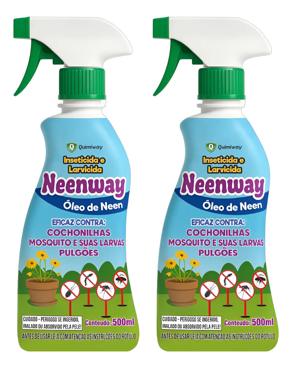 Oleo Neem NeenWay Anti Insetos Jardim 500ml Pronto Uso 2Un Descrição do Produto: NEENWAY é um inseticida/larvicida elaborado com (Óleo de Neem), eficaz no controle de Cochonilha(Orthezia praelonga)) larvas e adultos é de Mosquitos (Aedes aegypti) e Pulgões (Aphis gossypii) Modo de Uso: Aplicar 500 ml de NEENWAY para cada 30m² ,pulverizando as plantas de maneira uniforme, manter o jato a uma distância de 50 cm da planta infestada, preferencialmente, após a rega, pela manhã ou no fim do dia. Quando houver grandes infestações, pulverizar o produto semanalmente até a completa eliminação dos insetos e pragas. No caso de prevenção pulverizar uma vez ao mês. PRECAUÇÕES: CONSERVAR O PRODUTO LONGE DO ALCANCE DE CRIANÇAS E ANIMAIS Durante a aplicação não devem permanecer no local pessoas ou animais Não aplicar sobre alimentos e utensílios de cozinha e aquários. Não aplicar em hortas e pomares. Não reutilizar as embalagens vazias. Manter o produto na embalagem original. | Detalhes do produto: - Quantidade: 2 Oleo Neem NeenWay Anti Insetos Jardim - Embalagem: 2 Potes de 500ml - Pronto uso. - Eficaz contra Cochonilha, Mosquito, Suas Larvas e Pulgões. - Tem o melhor custo benefício do mercado. - Marca: Quimiway Obs.: Pedidos feitos após às 15hs serão enviados no dia útil seguinte! *Todos os nossos produtos são novos e originais, acompanham nota fiscal, que é enviada juntamente com a sua compra.* *Garanta a sua compra na PestShop o Melhor Atendimento segundo Nossos Clientes*